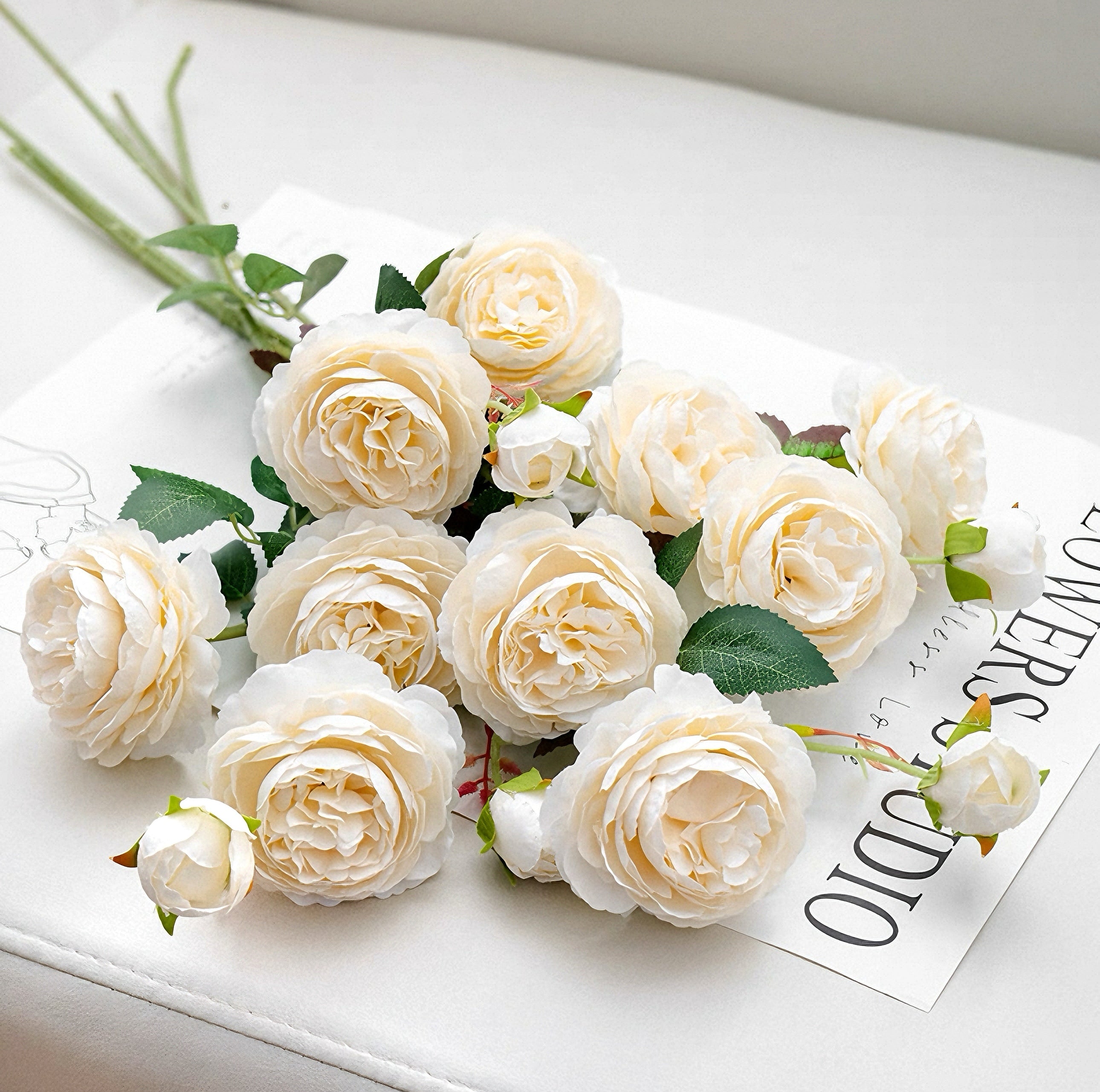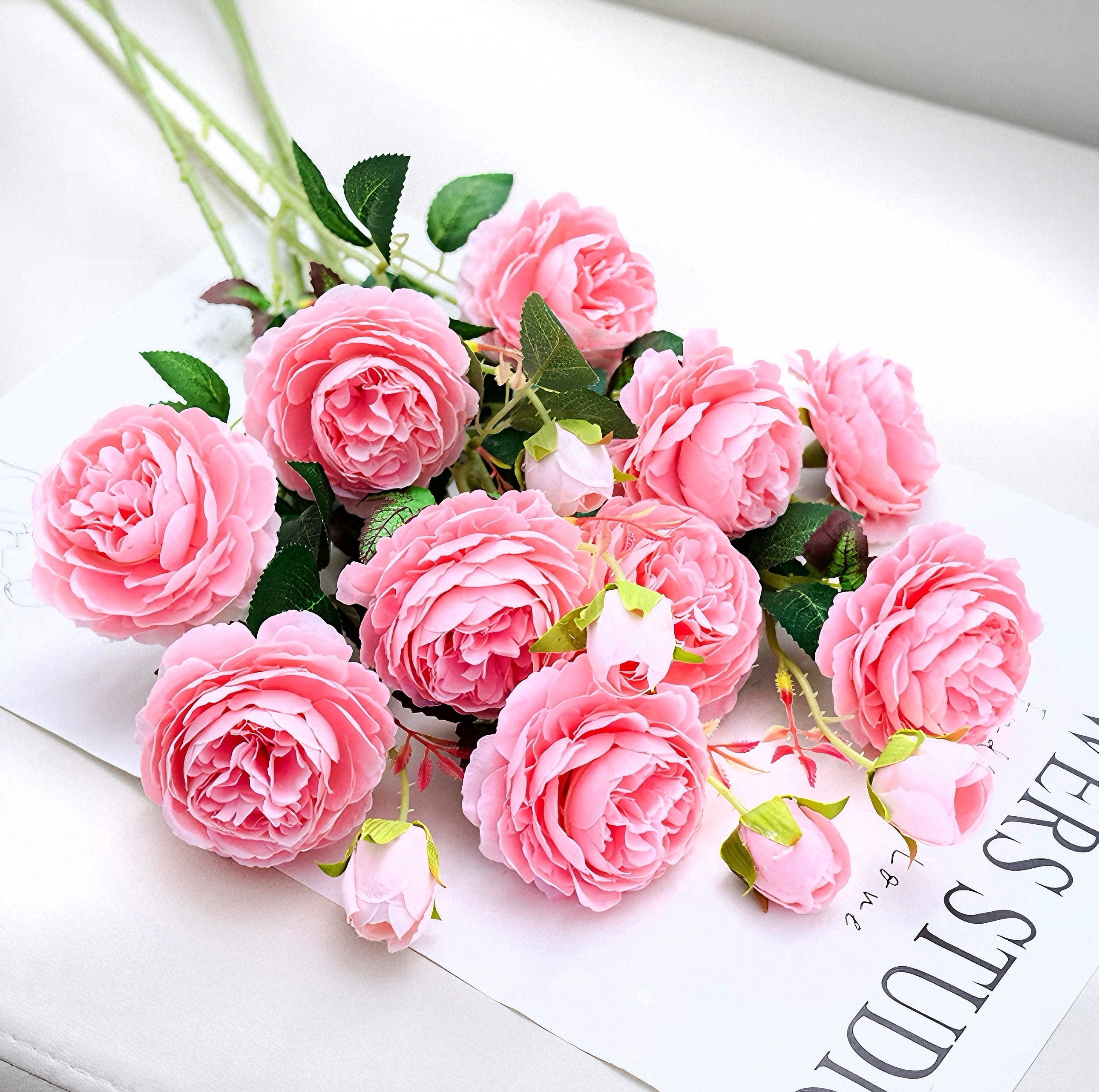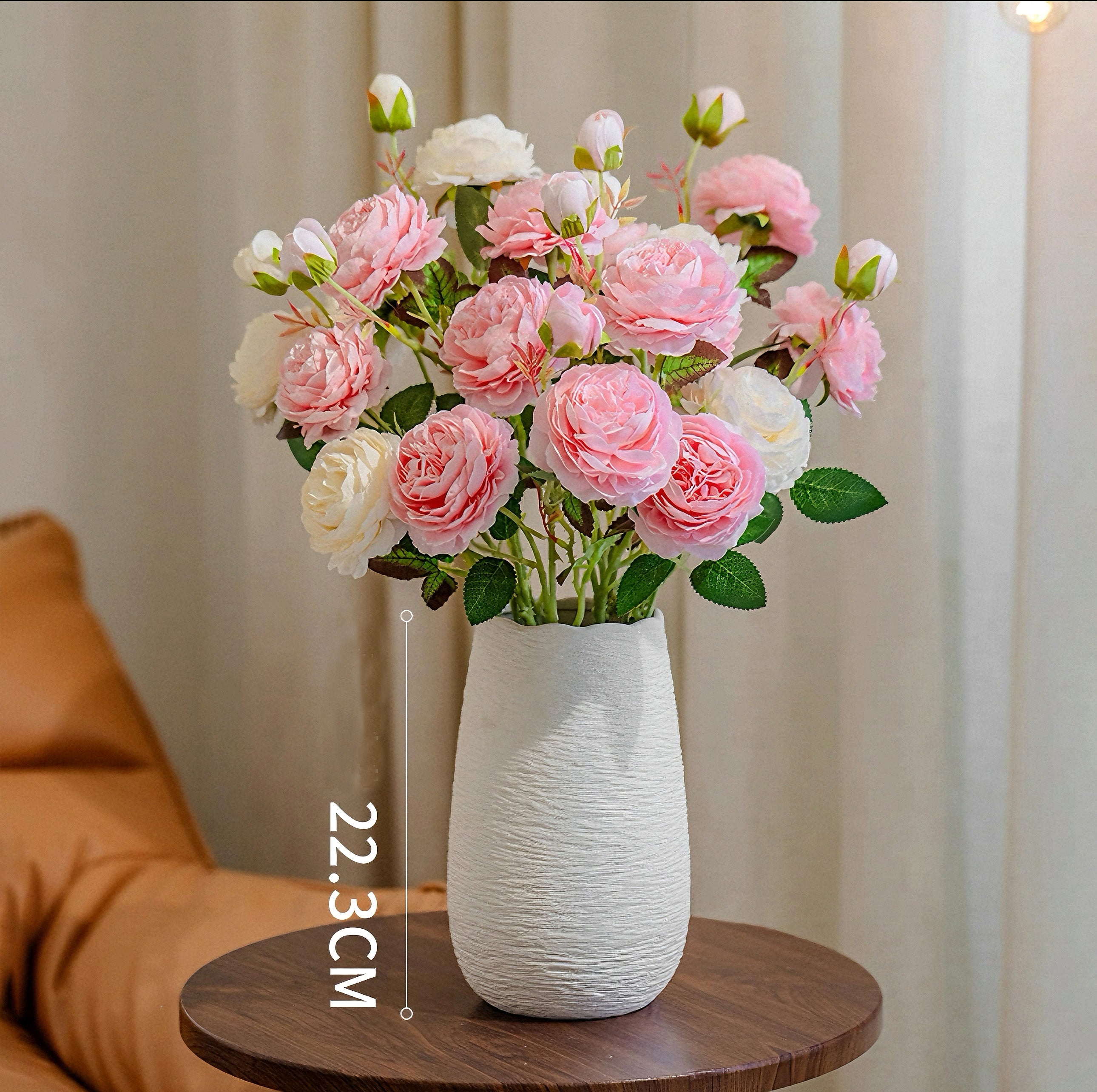 This elegant blush pink and cream English rose arrangement brings a lush, romantic ambiance to your space. Its lifelike blooms in soft pink and cream hues, paired with vivid green foliage, create a sophisticated focal point that elevates any room’s decor.