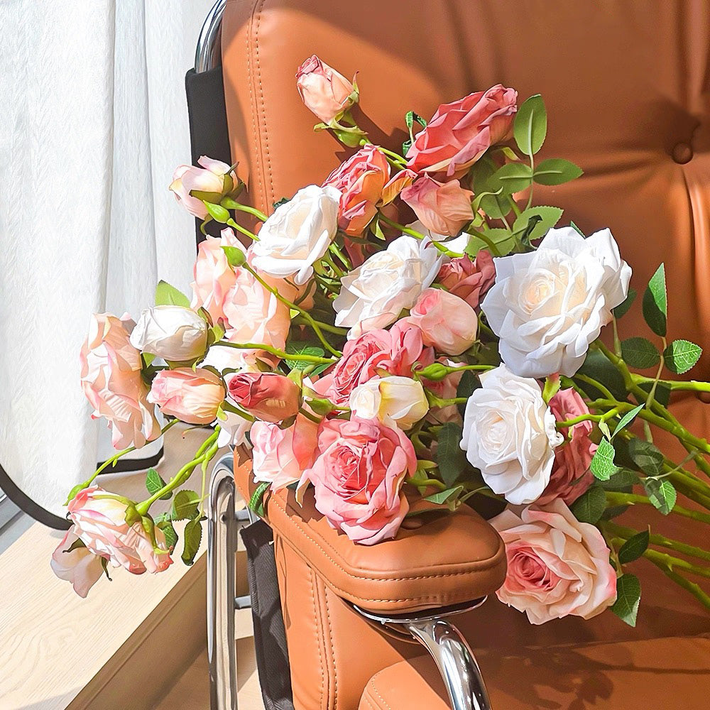 This Blush Rose Symphony Artisan Faux Floral Arrangement features a curated blend of blush, pink, and cream roses, artfully arranged in a textured, cream-colored vase. Each petal is crafted for lifelike detail, offering timeless elegance that requires no maintenance. It infuses any space—from cozy living rooms to chic bedrooms—with a romantic, sophisticated charm, making it a lasting centerpiece or a refined gift for those who appreciate enduring beauty.